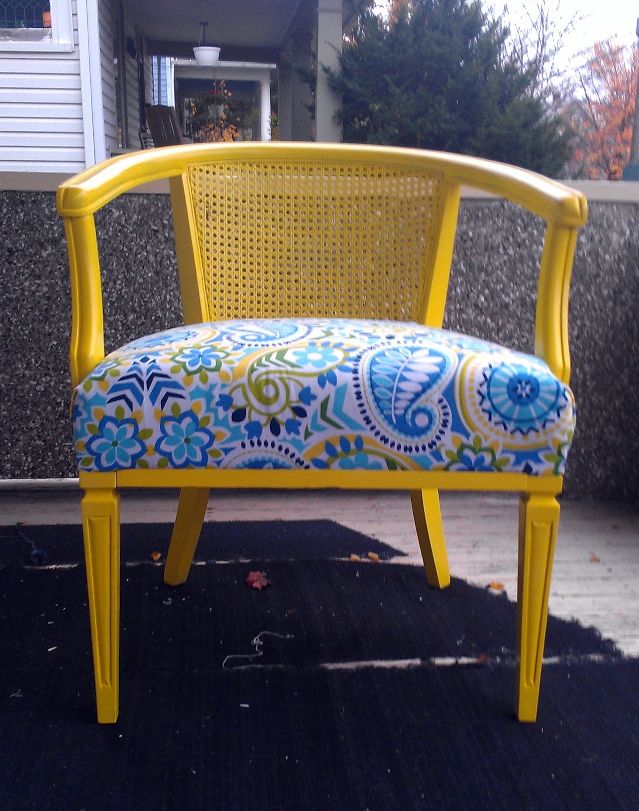I wanted a nice bright color and opted for spray paint, what with so many nooks an crannies. I got a super bright yellow (after I was told no aqua/turquoise) to match a lovely print I found at Joanns. It was crazy taking off the old cushion. A million or so staple later we had a look inside and saw the springs/foam/batting. After a discussion with one of the ladies at joanns, I was on my with with a pile of supplies. I think the foam I chose was a bit higher, but I can't be sure if that was because of the old one being compressed by use. It is super comfy though and you can no longer feel the springs when you sit. I had a bit of a problem when I just traced the old cushion and it was a bit small with the added height, but we made it work. I just love how it turned out. Such a happy chair!